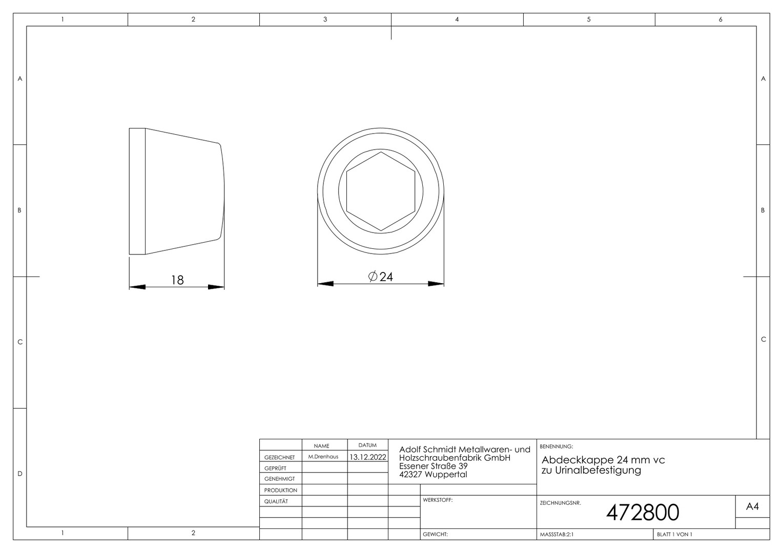 ASW Abdeckkappe Kappe d= 24mm, für Urinalbefestigung, verchromt