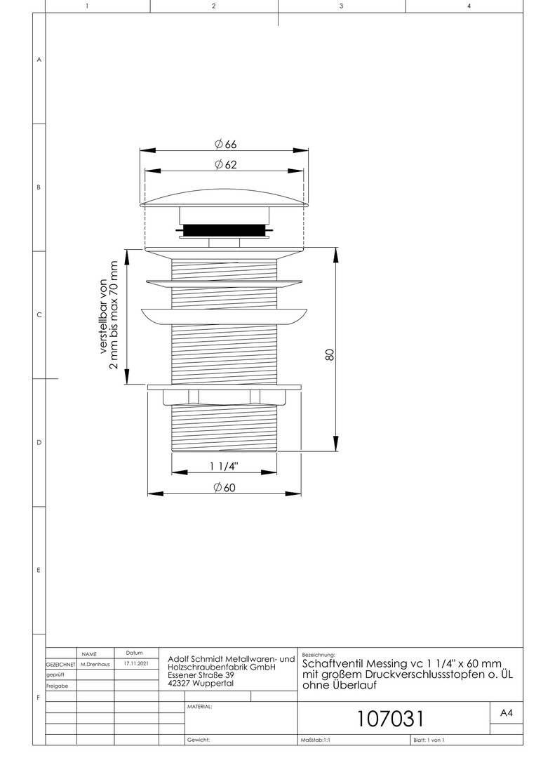 ASW Ablaufventil 1 1/4"xd= 63mm, d= 66mm, Messing verchromt, Schaftlänge 80 mm, ohne Überlaufschlitze