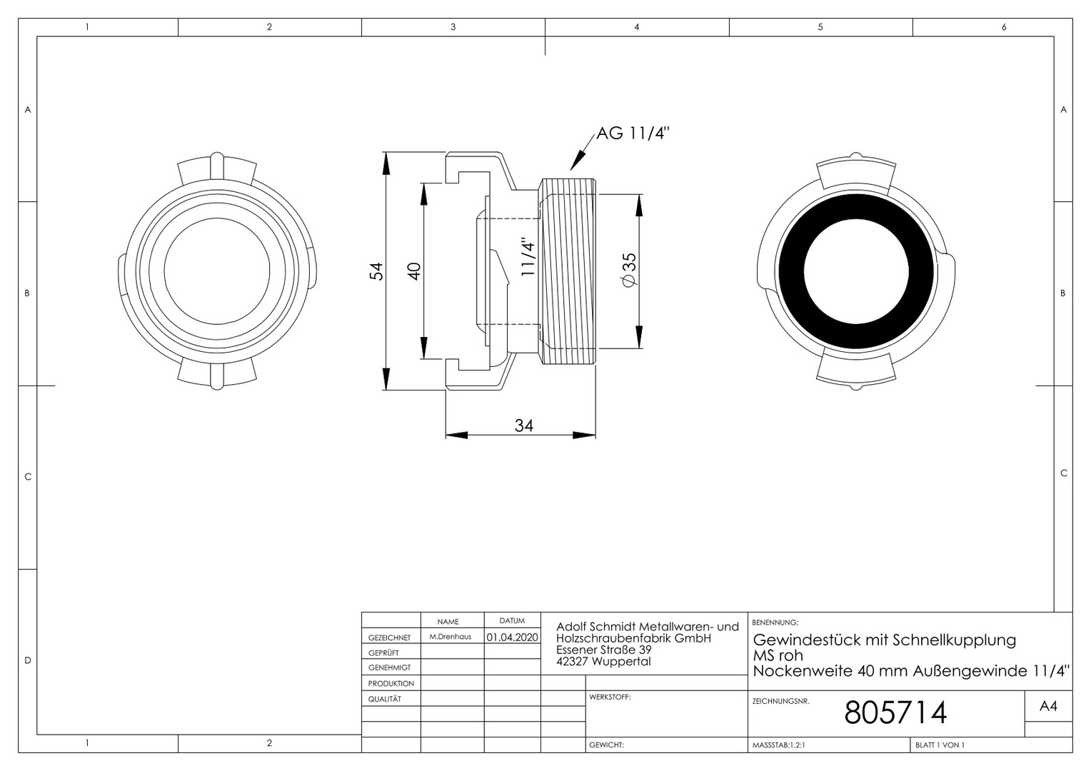 ASW Gewindestück AG 1 1/4", Nockenweite 40mm, Messing roh