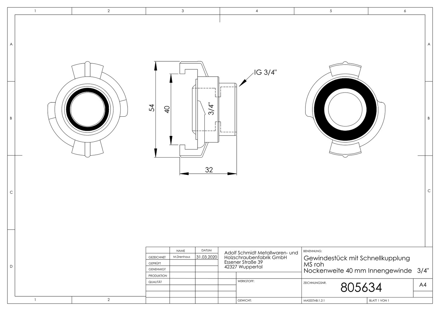 ASW Gewindestück IG 3/4", Nockenweite 40mm, Messing roh