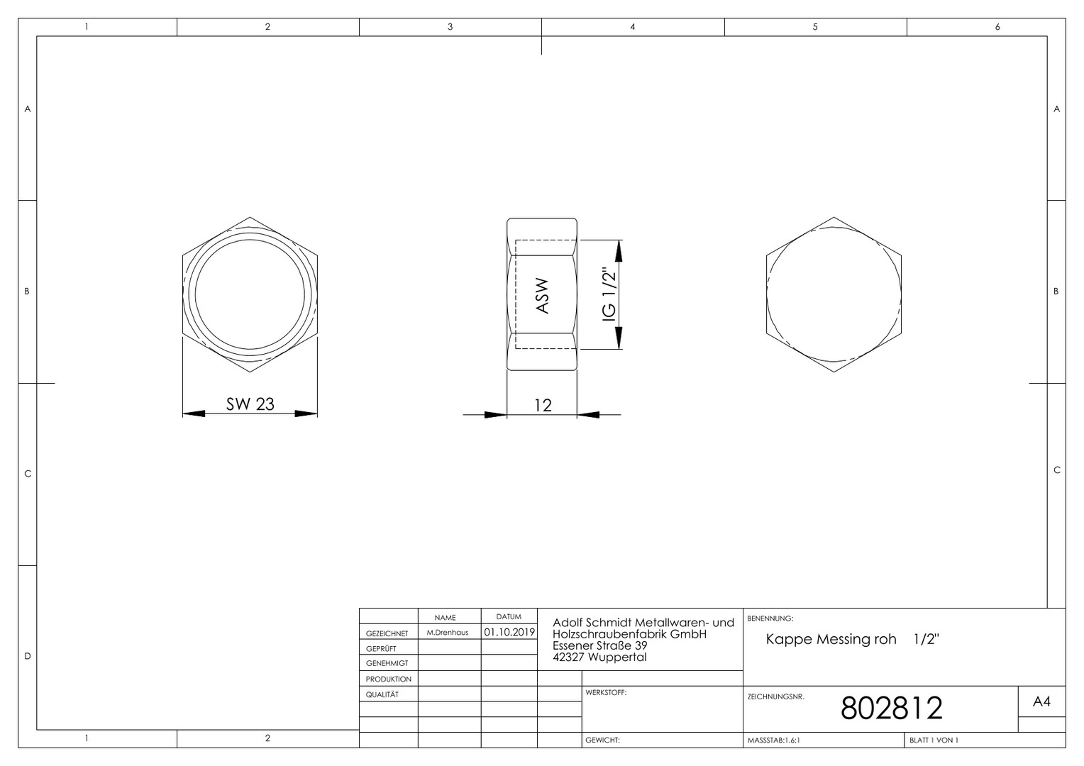 ASW Kappe 1/2", mit Sechskant, Messing CW617N roh