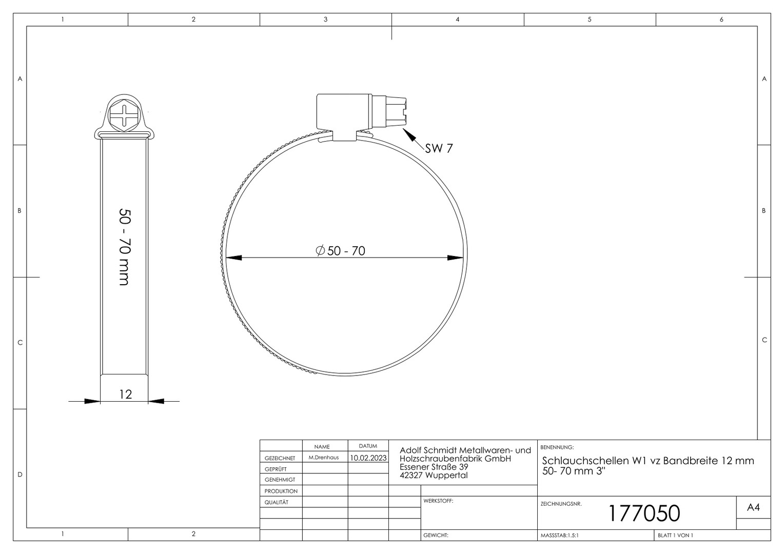 ASW Schlauchschelle W1 50-70 mm, 2 1/2"+3", Bandbreite 12mm, Stahl verzinkt