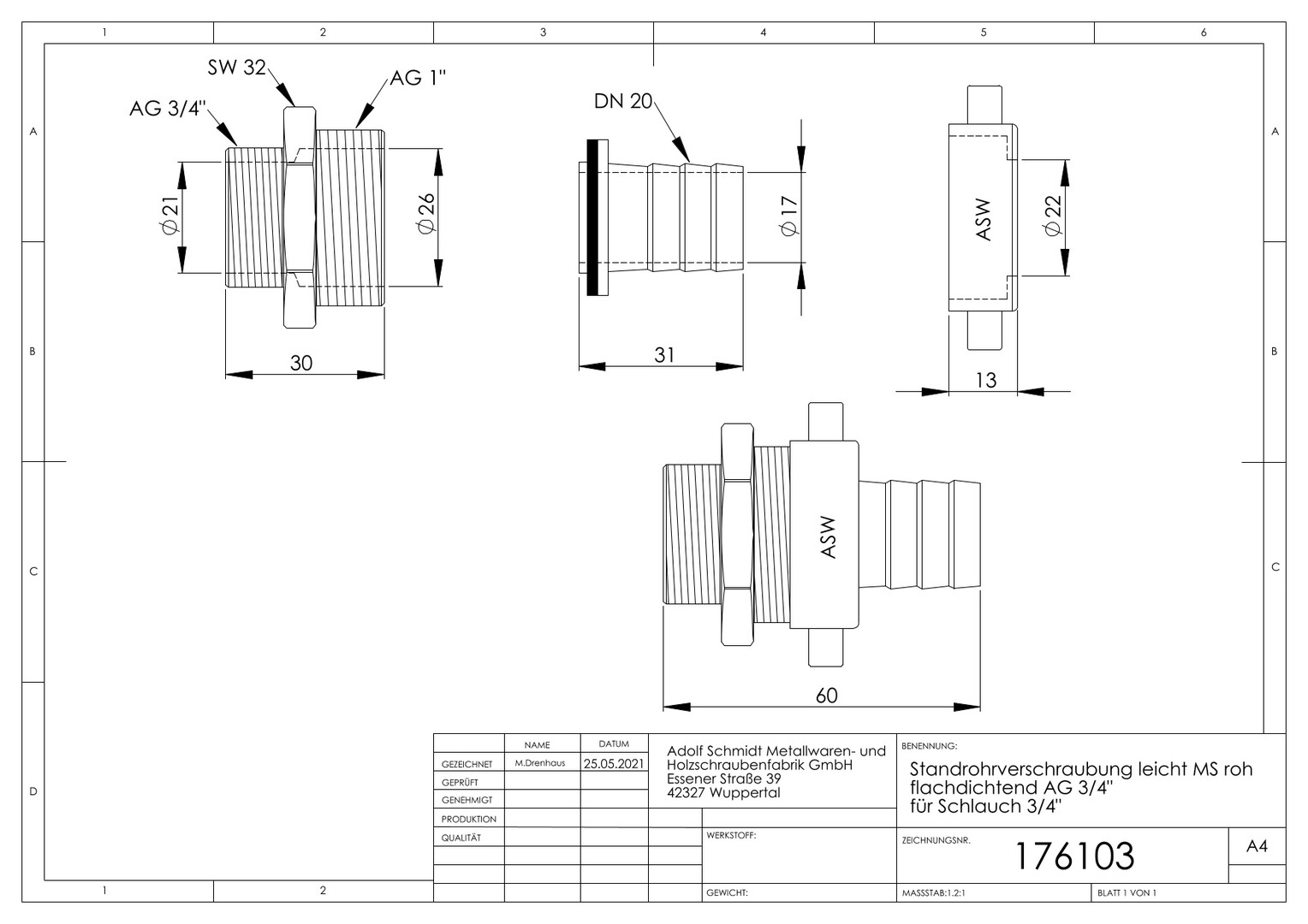 ASW Standrohrverschraubung AG 3/4" für Schlauch 3/4", flachdichtend, Messing roh