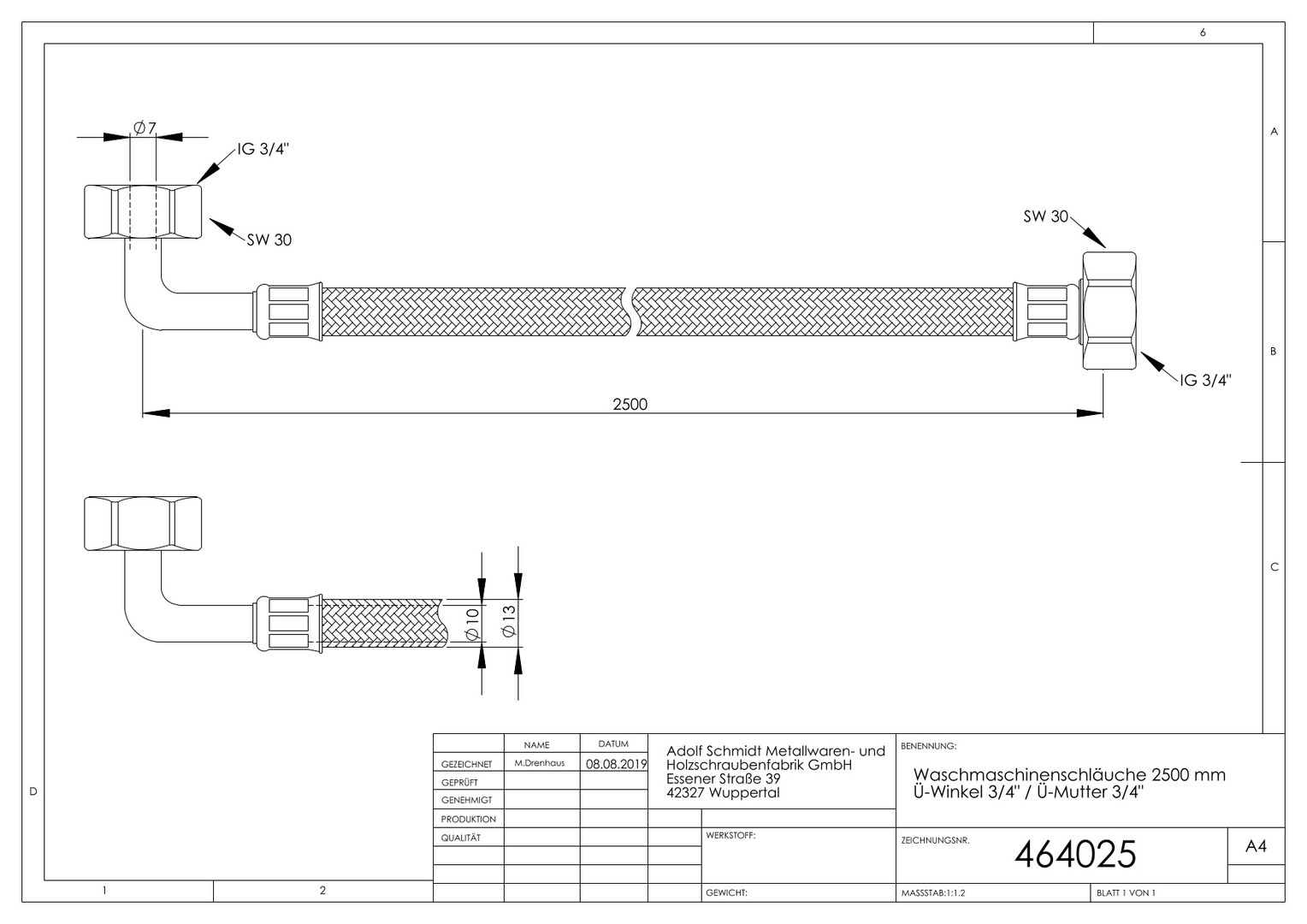ASW Wasch-/Spülmaschinen-Zulaufschlauch 2500 mm, DN 10, 3/8", EPDM mit Edelstahlumflechtung