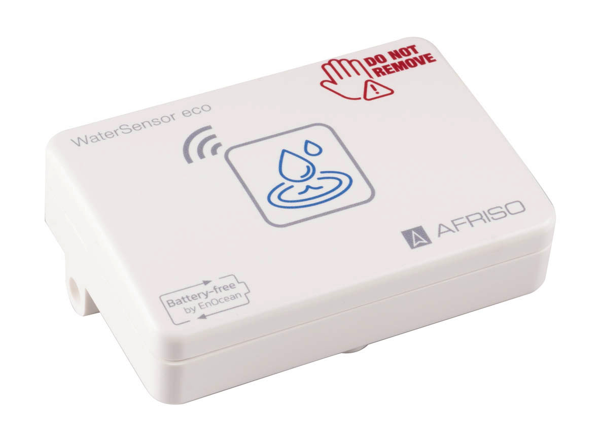 zur Detektion von Wasseransammlungen an zuvor bestimmter horizontaler Fläche oder Position (z. B. unter Rohrleitungen, Armaturen, im Bereich von Waschmaschinen, unter Badewannen, Spülmaschinen, in Wohnungen, in Hauswirtschaftsräumen, in Kellern usw), geeignet für das Medium Wasser, der WaterSensor eco ist mit Quellscheiben als Sensor ausgestattet und arbeitet ohne zusätzliche Stromquelle, im Leckagefall dehnen sich die Quellscheiben aus und erzeugen so die nötige Hilfsenergie die zur Versendung der Ereignismeldung an das WaterControl 01 oder das AFRISO Gateway benötigt wird, die Ereignismeldung wird beim Ausdehnen oder Schrumpfen der Quellscheiben gesendet, das AFRISOhome Gateway überträgt Warnmeldungen und Zustandsänderungen über WLAN oder LAN an die zuständigen Ansprechpartner mit der Information welcher WaterSensor eco die Zustandsänderung gemeldet hat, zusätzlich erforderliche Komponente: WaterControl und/oder AFRISOhome Gateway, Temperatureinsatzbereich Umgebung -25 bis +65 °C, Temperatureinsatzbereich Lagerung -25 bis +65 °C, Medium 1-65 °C, Ansprechhöhe 1,5 mm, Ansprechverzögerung < 6 min (bei den ersten 5 Quellvorgängen) bis zu 1 Stunde (bei 6. bis 10. Quellvorgang), Versorgungsspannung Energy Harvesting (über Quellscheiben), Gehäuse aus Kunststoff (PC) in weiß (ähnlich RAL 9003, 80 x 55 x 30 mm, Gewicht 66 g, Schutzart IP 43 (EN 60529)), mit WaterSensor eco und Klebestreifen