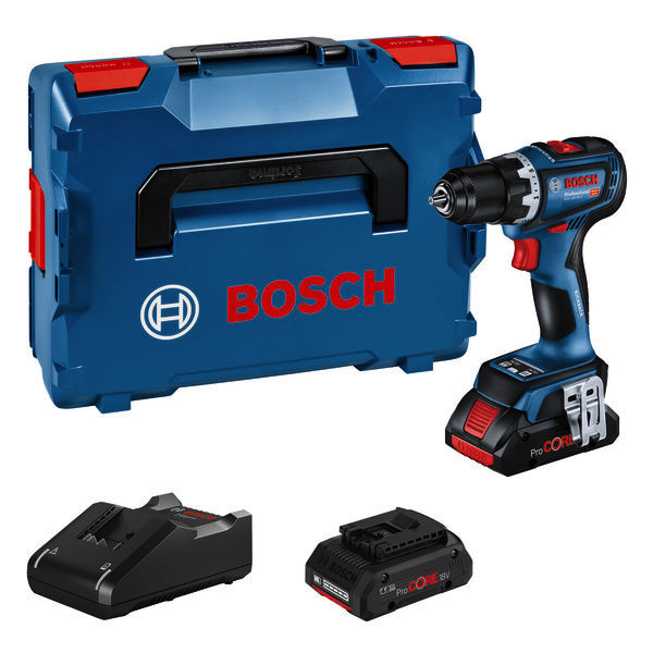 Akku-Bohrschrauber GSR 18V-90 C, Der GSR 18V-90 C Professional ist ein kraftvoller Akku-Bohrschrauber mit einem bürstenlosen Motor, der mit 64 Nm und 2.100 min⁻¹ Höchstleistung liefert. Seine kompakte Kopflänge von 163 mm sorgt für perfekte Handlichkeit. Das robuste 13-mm-Metallfutter gewährleistet ausgezeichnete Drehmomentübertragung bei jeder Arbeit. Der Bohrschrauber ermöglicht eine hervorragende Werkzeugkontrolle für höheren Anwender- als auch Werkzeugschutz: Das HMI bietet eine einstellbare KickBack Control-Funktion, die bei einem Verkanten des Werkzeugs und plötzlicher Werkzeugrotation das Rückschlagrisiko reduziert. Die verstellbare Precision Clutch-Funktion verhindert ein Überdrehen nach Erreichen des voreingestellten Drehmoments, und reduziert dadurch Kupplungsverschleiß sowie Geräuschbildung. Dieses Werkzeug wurde zum Bohren in Holz mit einem maximalen Durchmesser von 68 mm sowie in Stahl mit einem Durchmesser bis 13 mm konzipiert. Der GSR 18V-90 C Professional ist kompatibel mit allen Bosch Professional 18V-Akkus und -Ladegeräten (Professional 18V System). Auch kompatibel mit AMPShare, der markenübergreifenden Akku-Allianz. L-BOXX 136 (1 600 A01 2G0). 1/1 L-BOXX-Einlage für Gerät (1 600 A02 K83). 2 x Akku ProCORE18V 4.0Ah (1 600 A01 6GB). Schnellladegerät GAL 18V-40 Professional (1 600 A01 9RJ). 1 x Bluetooth Low Energy Modul GCY 42 Professional (1 600 A01 3WF)