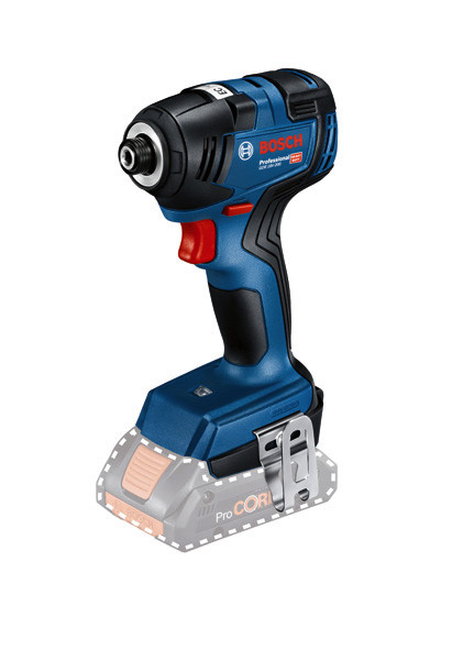 Akku-Drehschlagschrauber GDR 18V-200, Der Akku-Drehschlagschrauber GDR 18V-200 Professional bietet ein ausgezeichnetes Leistungs-Größen-Verhältnis und eine 1/4"-Bit-Aufnahme. Mit einer Kopflänge von 126 mm eignet sich dieser Akku-Drehschlagschrauber sogar für Arbeiten auf beengtem Raum. Der GDR 18V-200 ist mit einem bürstenlosen Motor für ein starkes Anziehmoment von 200 Nm ausgestattet und bietet eine ausgezeichnete Akkulaufleistung sowie eine lange Werkzeuglebensdauer. Für eine bessere Kontrolle über Drehzahl und Drehmoment verfügt dieser Akku-Drehschlagschrauber über einen Gasgebeschalter. Der GDR 18V-200 Professional ist zum Anziehen und Entfernen von Schrauben bei Arbeiten in Metallblech, Metall und Holz vorgesehen. Außerdem ist dieser Akku-Drehschlagschrauber mit allen Bosch Professional 18-Volt-Akkus und -Ladegeräten (Professional 18V System) kompatibel. Auch kompatibel mit AMPShare, der markenübergreifenden Akku-Allianz. Das Gerät verfügt außerdem über Electronic Cell Protection (ECP), ein LED-Licht und einen Gürtelclip. Karton