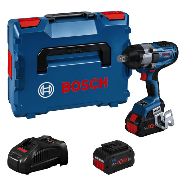 Akku-Drehschlagschrauber GDS 18V-1050 H, Der GDS 18V-1050 H Professional ist der herausragende 3/4"-Drehschlagschrauber mit bürstenlosem Motor für größte Anwendungsvielfalt. Seine BITURBO Brushless-Technologie kombiniert die Leistung eines Kabelgeräts mit kabelloser Freiheit, optimiert für ProCORE18V-Akkus. Bei schwierigen Anwendungen bietet das neue Schlagwerk ein Anziehmoment von 1.050 Nm und ein Losbrechmoment von 1.700 Nm für besonders anspruchsvolle Arbeitsumgebungen. Hohe Vielseitigkeit bei der Leistungskontrolle wird durch die 3 Geschwindigkeits-/Drehmomentstufen gewährleistet, die eine Anpassung an die jeweiligen Arbeitsanforderungen erlauben. Die Hauptanwendungsbereiche des GDS 18V-1050 H Professional sind Metallanwendungen (M 10 – M 24) wie Stahlbaukonstruktionen, Metallverbindungen, Rohrmontage, LKW-Instandhaltung und Holzkonstruktionen. Er ist kompatibel mit allen Bosch Professional 18V-Akkus und -Ladegeräten (Professional 18V System). für maximale Leistung ProCORE18V ≥ 5,5 Ah verwenden. Auch kompatibel mit AMPShare, der markenübergreifenden Akku-Allianz. Der GDS 18V-1050 H Professional bietet zusätzliche Annehmlichkeiten wie ECP, EMP, eine Werkzeugstatusanzeige, LED-Licht, eine 3/4"-Werkzeugaufnahme mit Sprengring plus Sicherungsbohrung und einen Aufbewahrungsclip. 2 x Akku ProCORE18V 8.0Ah (1 600 A01 6GK). Schnellladegerät GAL 1880 CV (1 600 A00 B8G). L-BOXX 136 (1 600 A01 2G0). 1/1 L-BOXX-Einlage für Gerät und Ladegerät (1 600 A02 58Y). Leiterclip (1600 A02 3G7)