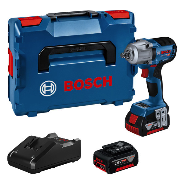 Akku-Drehschlagschrauber GDS 18V-450 HC, Arbeitserleichterung mit dem Akku-Drehschlagschrauber GDS 18V-450 HC Professional. Zwei Standardbetriebsarten am User Interface (Metallsschrauben/Muttern (A) und Holzschrauben (B)) sorgen für eine kontrollierte Anwendung und verhindern gebrochene Schraubenköpfe und den Verlust von Metallschrauben oder -muttern, indem der Drehschlagschrauber verlangsamt oder abschaltet. Jede Betriebsart kann über die Bosch Toolbox App bequem für die jeweilige Anwendung eingestellt werden. Anziehmoment von 450 Nm und Losbrechmoment von 800 Nm liefern Höchstleistung. Höhere Flexibilität und Kontrolle dank drei Geschwindigkeits-/Drehmomentstufen. Der Drehschlagschrauber ist ideal für Metallwerkstätten/Schlosser, Industriemontage, Rahmenbau und Fahrzeuginstandhaltung bei der Verwendung von Metallschrauben/Muttern von M10 bis M20. Das Gerät ist kompatibel mit allen Bosch Professional 18V-Akkus und -Ladegeräten (Professional 18V System). Auch kompatibel mit AMPShare, der markenübergreifenden Akku-Allianz. Der GDS 18V-450 HC verfügt für zusätzlichen Komfort über eine Werkzeugstatusanzeige, ein LED-Licht und einen Gürtelclip. 2 x Akku GBA 18V 5.0Ah (1 600 A00 2U5). Schnellladegerät GAL 18V-40 Professional (1 600 A01 9RJ). L-BOXX 136 (1 600 A01 2G0). 1/1 L-BOXX-Einlage (1 600 A02 DG5)