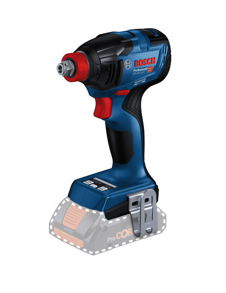 Akku-Drehschlagschrauber GDX 18V-210 C, Der kraftvolle Drehschlagschrauber GDX 18V-210 C Professional wurde für eine starke Leistung konstruiert, bietet ein hohes Maß an Flexibilität und beugt Materialschäden vor. Zwei Standardbetriebsarten am User Interface, Blechschraube (A) und Holzschraube (B), verhindern gebrochene oder abgeschlagene Schraubenköpfe, verschlissene Gewinde und Schäden an Werkstücken, indem der Drehschlagschrauber verlangsamt oder ausgeschaltet wird. Alle Betriebsarten lassen sich über die Bosch Toolbox App individuell einstellen. Die 2-in-1-Werkzeugaufnahme erleichtert einen schnellen und flexiblen Wechsel zwischen 1/4"-Innensechskant- und 1/2"-Vierkant-Werkzeugen. Die Leistung lässt sich über drei Geschwindigkeits-/Drehmomentstufen einstellen, was höhere Flexibilität und Kontrolle bietet. Dieser Drehschlagschrauber eignet sich für zahlreiche Anwendungen wie das Eindrehen von Blech- oder Holzschrauben oder Festziehen und Lösen von Metallschrauben- und Muttern (M 6 – M 16). Das Gerät ist kompatibel mit allen Bosch Professional 18V-Akkus und -Ladegeräten (Professional 18V System). Auch kompatibel mit AMPShare, der markenübergreifenden Akku-Allianz. Der GDX 18V-210 C Professional verfügt über Statusanzeige, Gürtelclip und LED-Licht für eine bessere Sicht. Karton