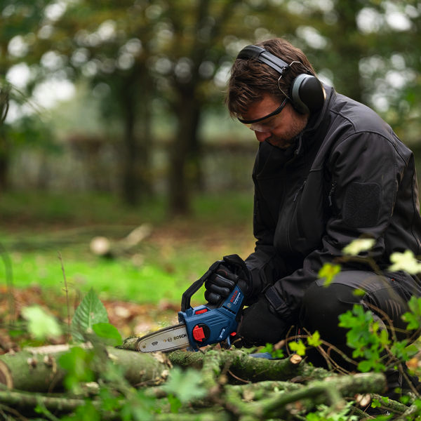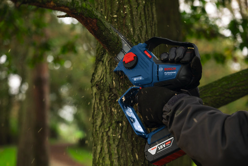 Akku-Hochentaster GKE 18V-15, Kettensägen können groß und unhandlich sein, besonders wenn auf engstem Raum gearbeitet wird. Die Bosch GKE 18V-15 Professional Astsäge ist sowohl leicht als auch kompakt und eignet sich perfekt für Arbeiten an schwer zugänglichen Stellen. Der bürstenlose Motor liefert kraftvolle Leistung und sorgt für eine lange Lebensdauer. Das automatische Kettenschmiersystem verbessert die Leistung weiter, indem die Kette immer geschmiert bleibt. Diese Astsäge wurde auch mit Blick auf eine verbesserte Kontrolle entwickelt: Sie verfügt über einen Gyrosensor, der die Bewegung überwacht und die Kettenbremse auslöst, wenn ein potenzieller Rückschlag erkannt wird. Die Bosch GKE 18V-15 Professional Astsäge ist ideal für den Baumschnitt, das Entfernen dickerer Äste und Heimwerkerschnitte bis zu 13 cm. Sie schneidet Weichholz, Hartholz, Äste und Bauholz für Heimwerkerarbeiten. Sie ist kompatibel mit dem Bosch Professional 18V System und mit der markenübergreifenden AMPShare Akku-Allianz. Mit einer Kapazität von bis zu 350 Schnitten pro Akkuladung bietet die GKE 18V-15 Professional Astsäge eine werkzeuglose Spannung für den schnellen Austausch der Oregon-Kette. Sie verfügt über einen variablen Gasgebeschalter für die Schnittkontrolle.