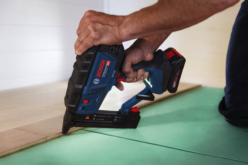Akku-Holzklammerer GTH 18V-38 M, Professionelle Handwerker möchten Klammern effizient und ohne zu große Belastung für Hand und Arm eintreiben. Wir haben den leistungsstarken, bürstenlosen GTH 18V-38 M Professional mit einem sehr geringen Rückschlag entwickelt, der das Handgelenk schont. Außerdem haben wir darauf geachtet, dass der Schmalrückenklammerer sich einhändig einschalten und bedienen lässt. Der GTH 18V-38 M Professional bietet die volle Leistung eines Druckluftgerätes, aber frei von Kompressor, Gaskartusche oder Kabel. Ideal für die Montage von Decken- und Bodenpaneelen mit Nut- und Federverbindung (verdeckte Nagelung), von Möbelrückwänden, Polstern, Zäunen aus Draht oder dünnen Latten, Holzgittern und Schalldämmungen. Kompatibel mit dem Bosch Professional 18V System und mit der markenübergreifenden AMPShare Akku-Allianz. Mit einhändig bedienbarem Ein-/Aus-Schalter, HMI mit Service-Warnung, Einzel- und Kontaktauslösung, benutzerfreundlicher stufenloser Tiefeneinstellung, Trockenschuss-Sperre, Doppel-LED, großem Sichtbereich an der Kontaktspitze. Geeignet für folgende Klammern: 9,5-38 mm, Rücken 5,8 mm, 18 ga (1,2 mm), und 0° Magazinwinkel. Karton