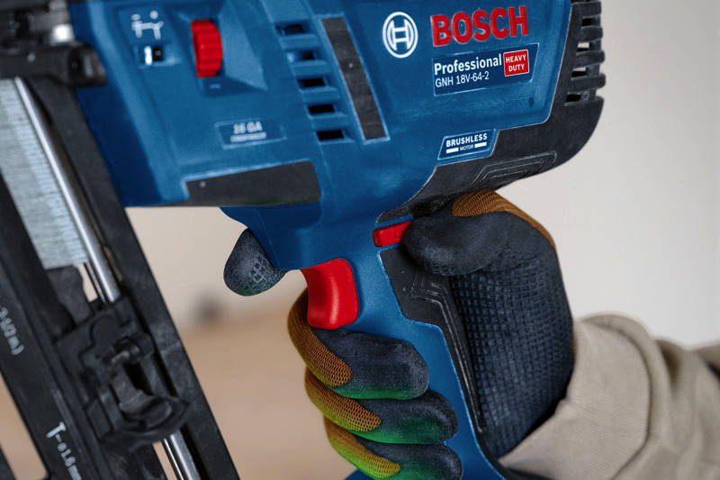 Akku-Holznagler GNH 18V-64-2, Als professioneller Handwerker willst du Nägel effizient und ohne zu große Belastung für Hand und Arm eintreiben. Wir haben den leistungsstarken, bürstenlosen GNH 18V-64-2 Professional mit einem sehr geringen Rückschlag entwickelt, der dein Handgelenk schont. Außerdem haben wir darauf geachtet, dass du das Werkzeug einhändig einschalten und bedienen kannst. Dieses Werkzeug bietet die volle Leistung eines Druckluftnaglers, aber frei von Kompressor, Gaskartusche oder Kabel. Ideal für die Montage von Fenster- und Türrahmen, Zierleisten, Balustern an Treppengeländern, Decken- und Bodenpaneelen mit Nut- und Federverbindung (verdeckte Nagelung), Täfelungen und Sockelleisten. Kompatibel mit dem Bosch Professional 18V System und mit der markenübergreifenden AMPShare Akku-Allianz. Mit einhändig bedienbarem Ein-/Aus-Schalter, HMI mit Service-Warnung, Einzelauslösung, benutzerfreundlicher stufenloser Tiefenverstellung, Trockenschuss-Sperre, Doppel-LED, großem Sichtbereich an der Kontaktspitze, werkzeuglosem Entfernen verklemmter Nägel. Geeignet für folgende Nägel: 32-64 mm, 16 ga (1,6 mm) und 20° Magazinwinkel. Karton