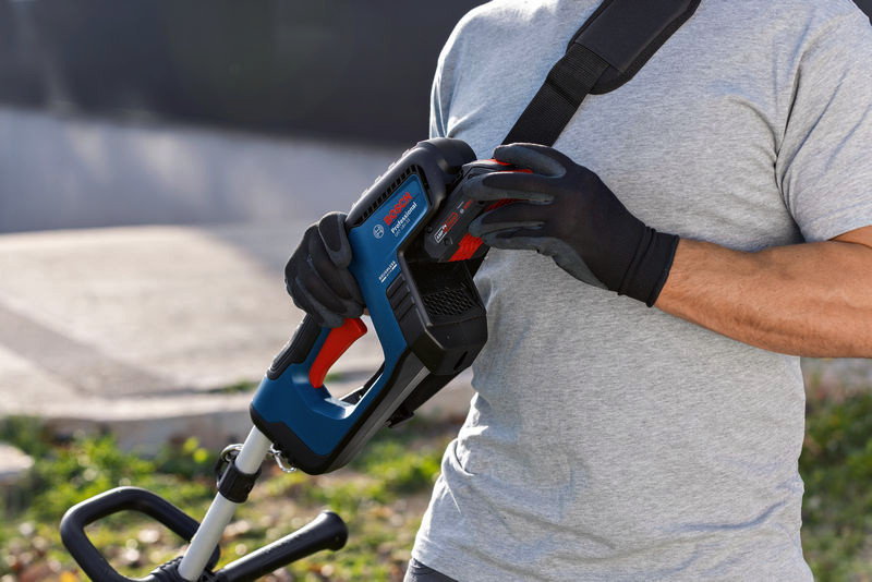 Akku-Rasentrimmer GRT 18V-33, Der Akku-Rasentrimmer GRT 18V-33 Professional ist das ideale Gerät zum Trimmen von langen Gräsern und hartnäckigem Unkraut auf mittelgroßen Grünflächen. Sein leistungsstarker, bürstenloser Motor steckt in einem robusten Aluminiumgehäuse. Die Drehzahl des Motors lässt sich manuell an die jeweiligen Arbeitsbedingungen anpassen, so dass auch Lautstärke und Laufzeit des Geräts optimiert werden. Die elektronische Drehzahlregelung hält die Drehzahl unter wechselnden Bedingungen automatisch konstant. Mit der Bosch Anti-Tangle Funktion musst du nie wieder dein Gerät von aufgewickeltem Unkraut befreien – sollte der Motor blockieren befreit sich das Gerät komplett von allein. Dank der robusten Pro-Tap-Spule mit EasyWind kannst du den Faden schnell aufwickeln, ohne die Spule zu öffnen. Der integrierte Pflanzenschutz erleichtert einen sauberen Abschluss an Rasenkanten und Wänden, da er Baumstämme und Pflanzen sicher vor dem rotierenden Faden abschirmt. Die leichte Bauweise, der verstellbare Griff und der mitgelieferte Schultergurt machen das Arbeiten angenehmer. Dank seines niedrigen Geräuschpegels eignet sich der Rasentrimmer auch für Arbeiten in Wohngebieten und anderen lärmsensiblen Bereichen. Kompatibel mit dem Bosch Professional 18V System und mit der markenübergreifenden AMPShare Akku-Allianz. Er ist mit einem langlebigen Aluminium-Motorgehäuse ausgestattet und wird mit einem bequemen Schultergurt geliefert. Karton. 1 x Schultergurt (F 016 L72 340). 1 x Fadenspuleneinheit (F 016 F05 841). Pflanzenschutzbügel (F 016 L78 582)