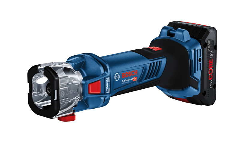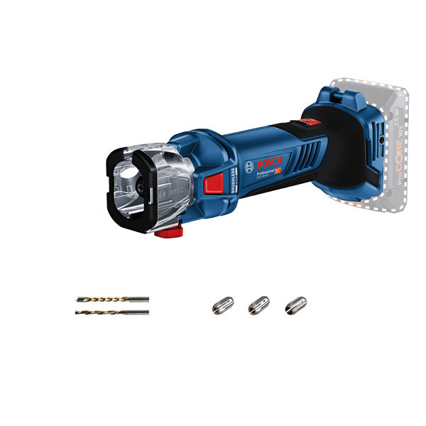 Akku-Trockenbaufräse GCU 18V-30, Dank ihrem kraftvollen bürstenlosen Motor mit einer Drehzahl von 30.000 min⁻¹ liefert die GCU 18V-30 den ganzen Tag Leistung und schneidet mehr als 100 Meter einer 12 mm dicken Trockenbauwand mit einem 1/8"-(3,17-mm-)Bit und einem einzigen ProCORE18V 4.0Ah-Akku. Die kompakte, leichte Bauweise ermöglicht bequemes Greifen in allen Positionen für länger ermüdungsfreies Arbeiten und ein staubdichter IP5X-Schalter, in den kein Trockenbaustaub eindringen kann, sorgt für eine höhere Werkzeuglebensdauer. Das Werkzeug ist geeignet für bündige Trockenbau-Schnitte nahe Fenstern, Türen, Zugangsplatten und Steckdosen. Sie schneidet auch Sperrholz, OSB und Deckenplatten, und ist kompatibel mit Spannzangen der Größen 3 mm, 6 mm, 1/8'', 5/32'', und 1/4''. Kompatibel mit dem Bosch Professional 18V System und mit der markenübergreifenden AMPShare Akku Allianz. Das Werkzeug wird standardmäßig mit 3 Spannzangen und einem hocheffizienten Staubadapter für einen gesünderen und saubereren Arbeitsort geliefert. Es verfügt auch über einen staubdichten IP5X-Schalter, der gegen feinen Trockenbaustaub und damit vorzeitigen Werkzeugausfall schützt, eine starke LED zur Beleuchtung des Schnittbereichs, eine Motorbremse für sofortiges Stoppen des Fräsers und einen Gürtelclip, damit du dein Werkzeug immer an deiner Seite hast. 3 x Spannzange 3,17 mm (1/8") / 3,96 mm (5/32") / 6,35 mm (1/4") (2 608 000 826). 1 x Saugadapter (2 608 000 825). 1 x Trockenbau-Spiralnutfräser mit Führungsspitze, 3,17 mm (1/8"). 1 x Mehrzweckfräser 3,17 mm (1/8"). 1 x Gürtelhaken (2 609 111 584). Spannzangenschlüssel