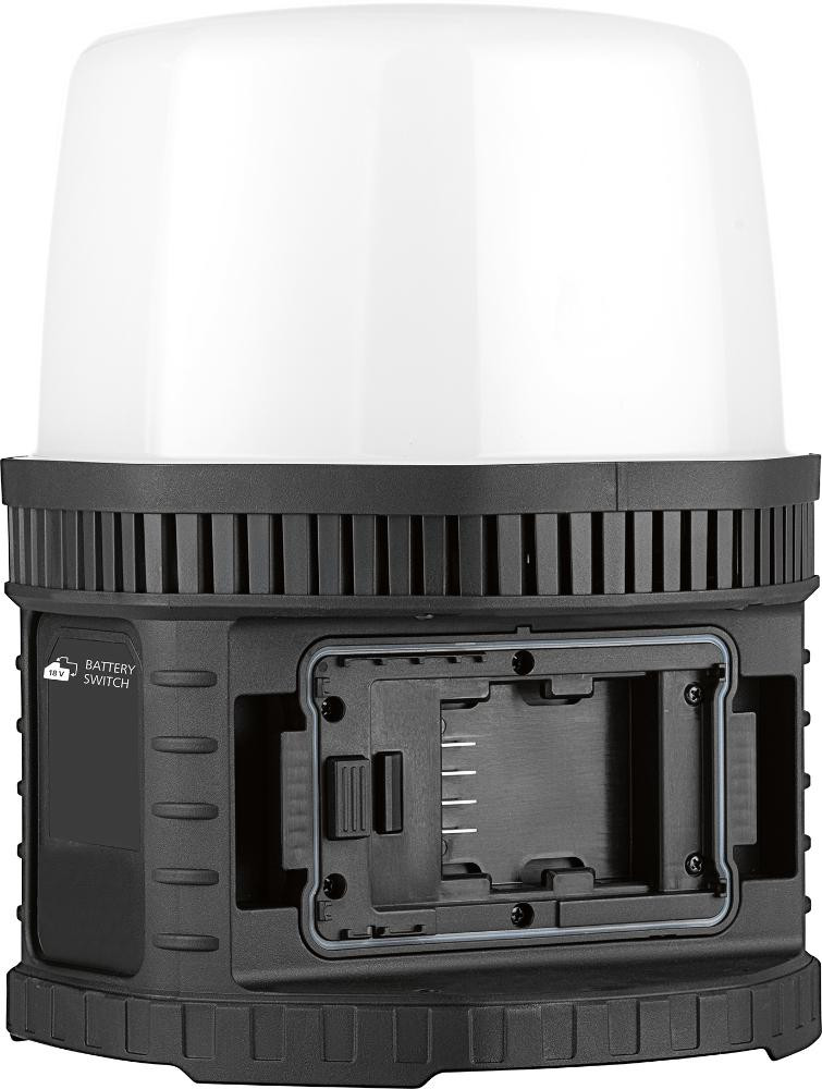Ausführung: Bruch- und schlagfestes Kunststoffgehäuse mit seitlichem Tragegriff und Diffusorabdeckung, hochwertige SMD-LED für eine großflächige und blendfreie Ausleuchtung, 360°-Abstrahlwinkel, mit warmem oder kaltem Licht (2700, 3500, 4500, 5500 oder 6500 Kelvin). Ausklappbarer Haken und Stativadapter im Sockel für flexible Befestigungsmöglichkeiten. Kompatibel mit 18-V-Akkus von Bosch (AmpShare), DeWalt, Milwaukee, Metabo (CAS) und Makita. Lieferung inkl. 5 Schnittstellen-Adaptern.