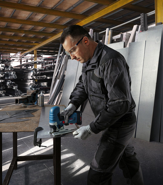 Akku-Stichsäge GST 18V-125 S, Das robuste Design und der kraftvolle bürstenlose Motor der GST 18V-125 S Professional (mit Stabgriff) sorgen für eine hervorragende Laufzeit und längere Lebensdauer des Werkzeugs. Die Akku-Stichsäge mit einem optimalen Preis-Leistungsverhältnis in ihrem Segment ist ein zuverlässiger Problemlöser für alle Anwendungen. Die GST 18V-125 S Professional bietet eine einfache Lösung, die auf wichtige Kernfunktionen wie SDS-Sägeblatthalter, LED, 4-stufigen Pendelhub, Staubblasfunktion und Drehzahlvorwahl fokussiert ist. Diese Akku-Stichsäge eignet sich ideal für Rund- und Querschnitte in Massivholz, Spanplatten und Holzverbundwerkstoffen sowie in dickeren oder härteren Materialien. Mit Adapter kann sie mit Führungsschienen verwendet werden. Das Werkzeug ist kompatibel mit externer Staubabsaugung und allen Bosch Professional 18V-Akkus und -Ladegeräten (Professional 18V System). Auch kompatibel mit AMPShare, der markenübergreifenden Akku-Allianz. Die Fußplatte der GST 18V-125 S Professional kann bis auf einen Winkel von 45° für Neigungsschnitte eingestellt werden. Das Werkzeug wird mit einer abnehmbaren Kunststoff-Abdeckhaube für den Schutz von empfindlichen Werkstücken geliefert. L-BOXX 136 (1 600 A01 2G0). 1/1-L-BOXX-Einlage für Gerät und Ladegerät (1 600 A02 HB7). 1 x Stichsägeblatt T 144 D, Speed for Wood (separat erhältlich als 3er-Pack: 2 608 630 560). Absaug-Set (ET-Nr. 1 619 P17 472). Spanreißschutz (2 601 016 096)