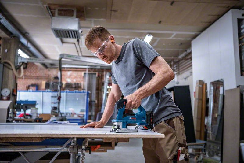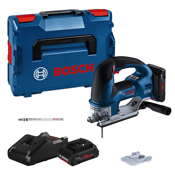 Akku-Stichsäge GST 18V-155 BC, Die GST 18V-155 BC Professional (mit Bügelgriff) bietet einen bürstenlosen Motor und ein gut ausbalanciertes Werkzeugdesign. Der Griffbereich oben und ihr Gasgebeschalter garantieren perfekte Werkzeugkontrolle. Ihre Sägeblattführung verhindert ein Verbiegen des Sägeblatts sogar bei kleinen Kurven und hilft mit perfekter Präzision bei der Arbeit. Das Werkzeug ist mit einer externen Staubabsaugung kompatibel. Ihr großer Sägeblattauswurfhebel und die Drop Control-Funktion gewährleisten besseren Gesundheitsschutz und höhere Sicherheit für den Anwender. Sie eignet sich ideal für Rund- und Querschnitte in Massivholz, Spanplatten und Holzverbundwerkstoffen sowie in dickeren oder härteren Materialien. Sie ist kompatibel mit Führungsschienen (über Adapter) und allen Bosch Professional 18V-Akkus und -Ladegeräten (Professional 18V System). Auch kompatibel mit AMPShare, der markenübergreifenden Akku-Allianz. Das Werkzeug verfügt über eine robuste Aluminiumdruckguss-Grundplatte mit zwei Befestigungspunkten für mehr Stabilität und Sicherheit. Ihr Connectivity Modul ermöglicht eine individuelle Einstellung von Drehzahl und Beleuchtung und liefert wichtige Werkzeuginformationen. 2 x Akku ProCORE18V 4.0Ah (1 600 A01 6GB). Schnellladegerät GAL 18V-40 Professional (1 600 A01 9RJ). L-BOXX 136 (1 600 A01 2G0). 1/1-L-BOXX-Einlage für Gerät und Ladegerät (1 600 A02 HB7). 1 x Stichsägeblatt T 144 DP, Precision for Wood (separat erhältlich als 3er-Pack: 2 608 633 A31). 1 x Stichsägeblatt T 308 BP, Precision for Wood (separat erhältlich als 3er-Pack: 2 608 667 399). Spanreißschutz (ET-Nr. 1 600 A02 08K). Absaugdüse (ET-Nr. 1 600 A01 C3Z). Abdeckhaube Staubabsaugung (ET-Nr. 1 600 A01 T4N)