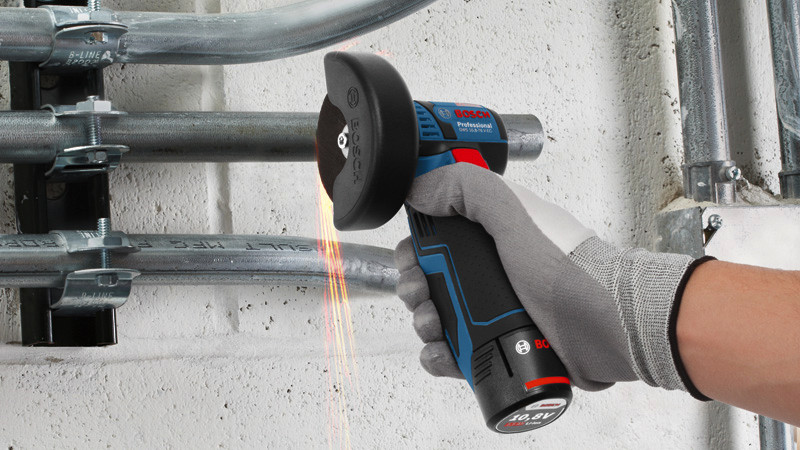 Akku-Winkelschleifer GWS 12V-76, Der kleine Akku-Winkelschleifer GWS 12V-76 Professional ist das weltweit erste Modell in der 12-Volt-Klasse. Er ist extrem kompakt und ergonomisch, was schnelles Trennen am Arbeitsplatz gewährleistet und das Gerät zur praktischen Lösung für Trennanwendungen in jeder Situation macht. Der leistungsstarke bürstenlose Motor dieses kleinen Winkelschleifers ermöglicht schnelles Arbeiten und eine hohe Produktivität. Das Gerät ist außerdem sehr vielseitig und eignet sich für die Arbeit mit verschiedensten Materialien, z. B. zum Trennen von Metall, Fliesen und Mauerwerk. Das Gerät ist mit allen Bosch Professional 12-Volt-Akkus und -Ladegeräten kompatibel (Professional 12V System). Der GWS 12V-76 Professional ist der weltweit erste professionelle kleine 12-Volt-Winkelschleifer. 1/2 L-BOXX-Einlage für GWS 12V-76 (1 600 A00 F0F). L-BOXX 102 (1 600 A01 2FZ). 1 x Karbidtrennscheibe, Carbide Multiwheel, 76 x 10 mm (2 608 901 196). 1/2 L-BOXX-Einlage für Ladegerät und Akku. 2 x Inox-Trennscheibe, Expert for Inox, 76 x 10 mm (separat erhältlich als 5er-Pack: 2 608 601 520). Schutzhaube (2 608 000 632)