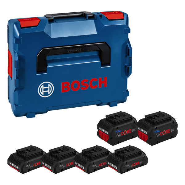 Akkupack 4 x ProCORE18V 4.0Ah + 2 x ProCORE18V 8.0Ah, Dies ist die Kombination aus dem kompakten und leichten ProCORE18V 4.0Ah-Akku und dem leistungsstarken ProCORE18V 8.0Ah-Akku für die Power eines kabelgebundenen 1.800-Watt-Werkzeugs. Unsere neueste Zellentechnologie mit 21700-Zellen und unser intelligentes Akkumanagement garantieren 87 % mehr Leistung als bei einem normalen Akku und die COOLPACK 2.0-Technologie dieses Akkus sorgt mit ihrem ausgezeichnetem Wärmemanagement für eine längere Lebensdauer und Laufzeit. Die Akkus ProCORE18V 4.0Ah und 8.0Ah sind mit einer hochauflösenden Ladezustandsanzeige mit 5 LEDs ausgestattet. Alle unsere Akkus sind seit 2008 mit neuen und bestehenden Werkzeugen von Bosch Professional innerhalb der gleichen Voltklasse kompatibel. Die L-BOXX 136 mit ihrer speziell entwickelten robusten Einlage bietet eine verbesserte Aufbewahrungs- und Transportlösung im Rahmen des Bosch Mobility Systems. Der optimierte Klickmechanismus der L-BOXX ermöglicht einfaches Öffnen gestapelter Boxen für bequeme Handhabung. Die umfassende Kompatibilität der L-BOXX-Varianten, Werkzeugeinlagen und des Sortimo Fahrzeugeinrichtungssystems sorgt für absolute Flexibilität. 2 x Akku ProCORE18V 8.0Ah (1 600 A01 6GK). 4 x ProCORE 18V 4.0Ah-Akku (1 600 A01 6GB). L-BOXX 136 (1 600 A01 2G0). 1/1 L-BOXX-Einlage für Starter-Sets (1 600 A02 BV4)