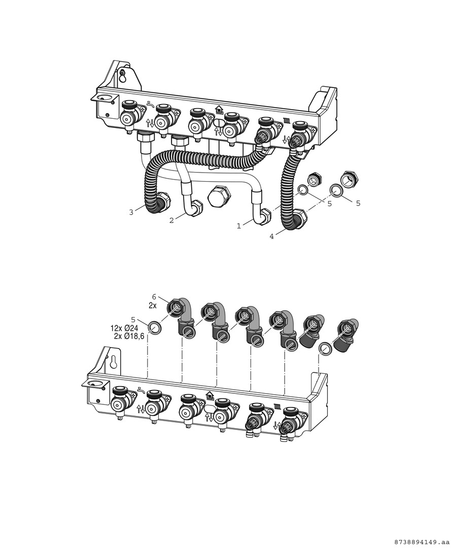 bestehend aus 2x Panzerschläuche mit Trinkwasserzulassung (HIU-seitiger Anschluss 90° Bogen mit Drehteil und 1/2" Überwurfmutter, heizungsseitiger Anschluss Drehteil und 3/4" Überwurfmutter, 2x Edelstahlwellrohre mit einem vorkonfektioniertem 90°C Bogen (HIU-seitiger Anschluss 90° Bogen mit einem Drehteil und 3/4" Überwurfmutter, heizungsseitiger Anschluss Drehteil und 3/4" Überwurfmutter), 2x 90 °C Kupferbogen für Anschluss Primärkreis nach oben/ unten 3/4" Überwurfmutter und 3/4" Buchse