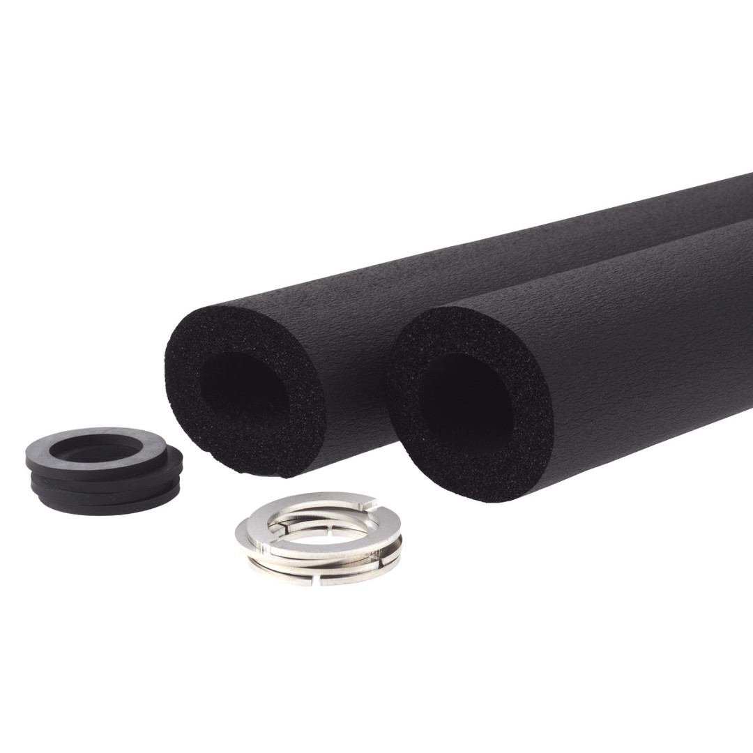 aus hochflexiblem Weichschaum auf Synthesekautschuk-Basis, alle benötigten Teile und eine Kurzanleitung für ein nachträgliches Anbringen auf jeweils zwei vorhandene Wellrohrschläuche