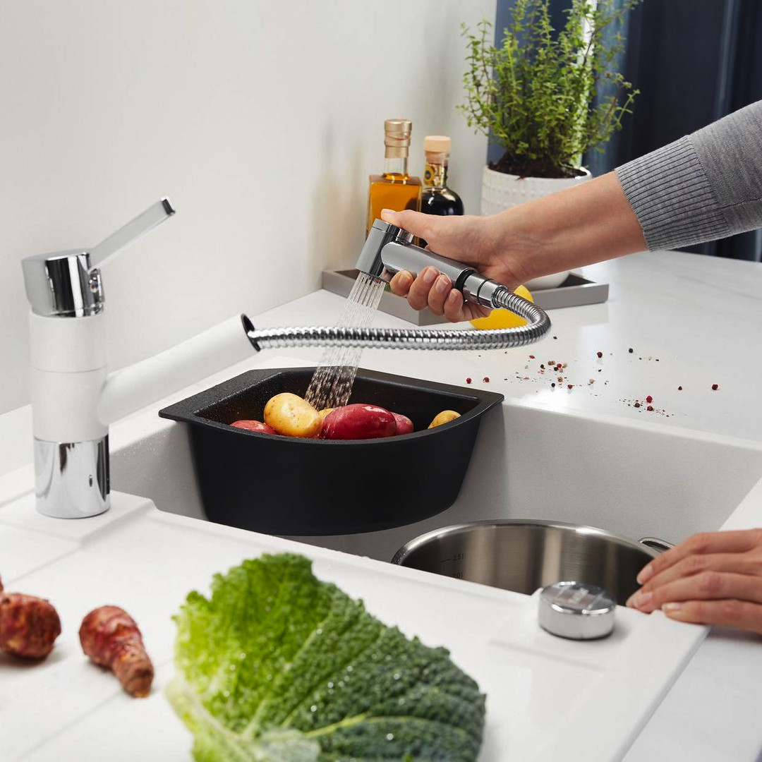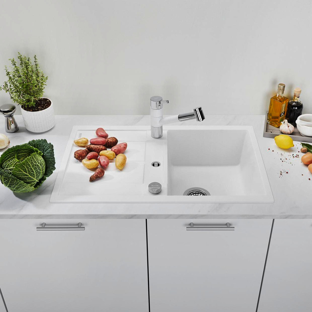 Beckentiefe 19/2,5 cm, Abtropffläche mit integriertem Ausguss, flache Randgestaltung, Ablaufgarnitur mit Raumsparrohr, 3 1/2" Korbventil mit integrierter Ablauffernbedienung (Drehknopf), reversibel einbaubar, Einbau von oben, Untermaß 45 cm
