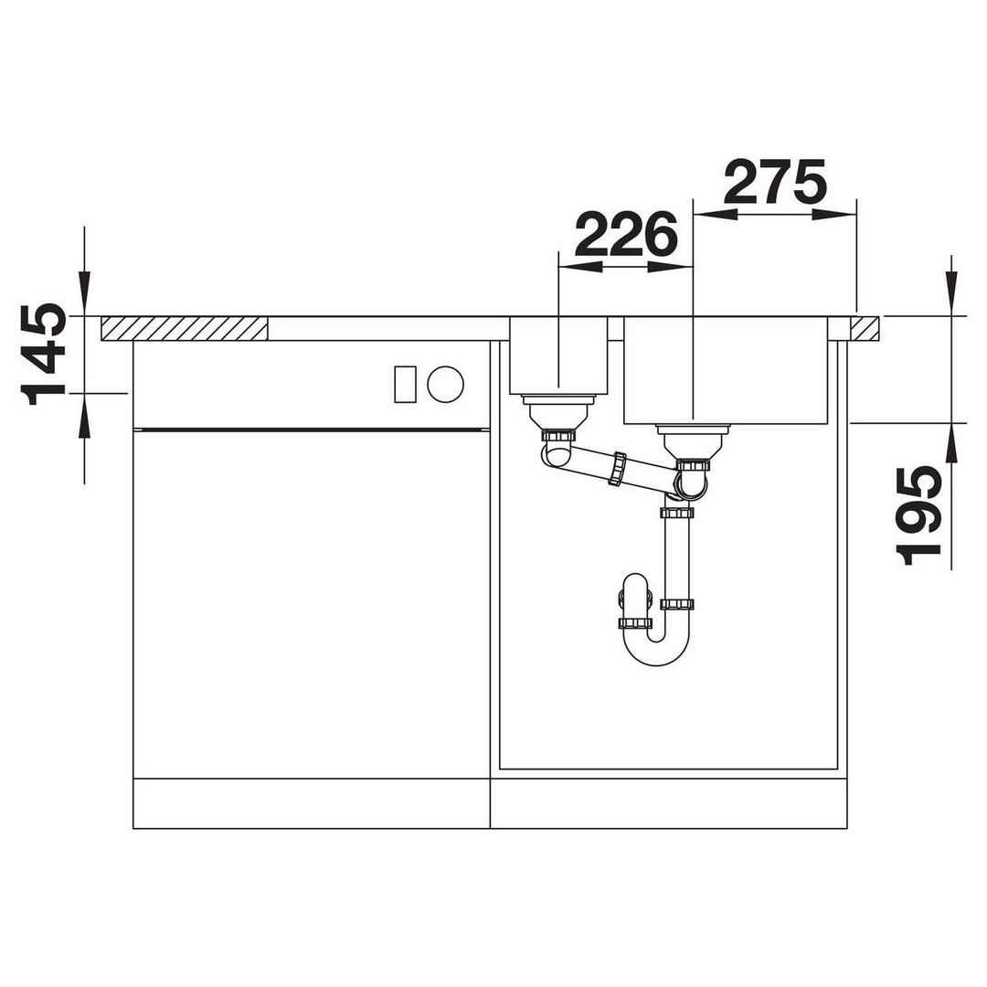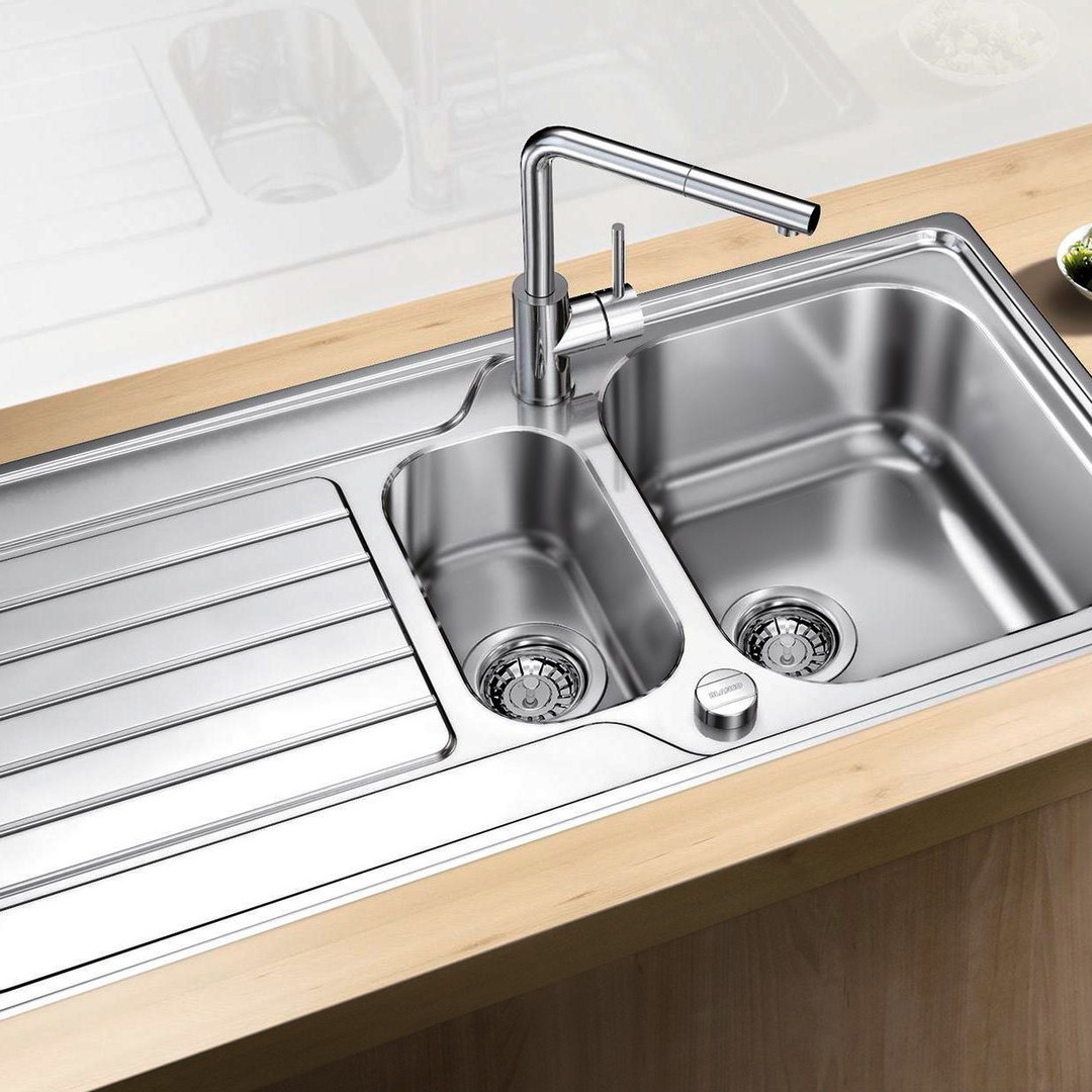 Beckentiefe 19,5/14,5 cm, mit Zusatzbecken, funktionale Abtropffläche, Ablaufgarnitur mit Raumsparrohr, 2x 3 1/2" Korbventil mit Ablauffernbedienung (Drehbetätigung) für das Hauptbecken, Dichtung, reversibel einbaubar, Einbau von oben, Untermaß 60 cm