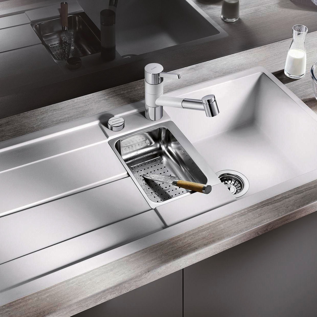 Beckentiefe 19/14,5 cm, zusätzliches Becken und Abtropffläche, Multifunktionsschale aus Edelstahl, Ablaufgarnitur mit Raumsparrohr, 2x 3 1/2" Korbventile mit integrierter Ablauffernbedienung (Drehbetätigung) für das Hauptbecken, reversibel einbaubar, unterbündiger Einbau, flächenbündiger Einbau