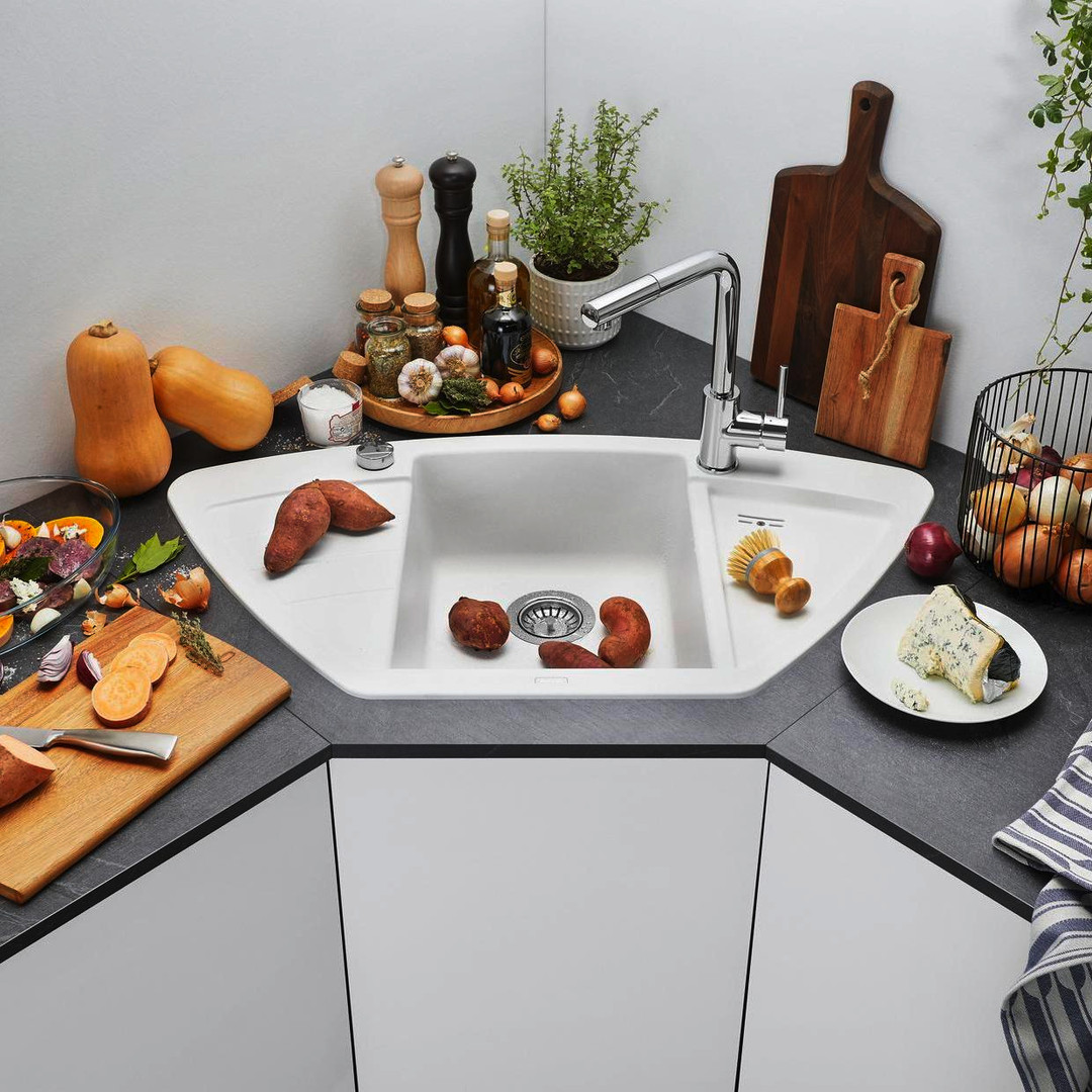 Beckentiefe 18/2,7 cm, Ablaufgarnitur mit Raumsparrohr, 3 1/2" Korbventil mit integrierter Ablauffernbedienung (Drehknopf), Becken mittig, kompakte Abtropffläche, vertiefte Ausgusszone, für Eck- und Zeileneinbau geeignet, Einbau von oben, Eck-Maß 90 x 90 cm