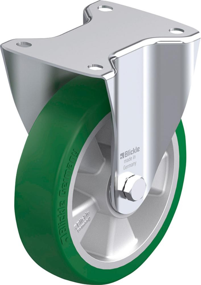 • Lauffläche: Polyurethan-Elastomer Blickle Softhane® 75 Shore A, Farbe grün, spurlos und kontaktverfärbungsfrei