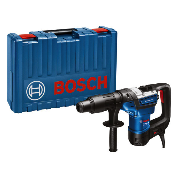 Bohrhammer mit SDS max GBH 5-40 D, Der GBH 5-40 D Professional ist das kabelgebundene Einstiegsmodell im Bosch SDS max Bohrhammer Segment. Durch das geringe Gewicht und die kompakte Bauform ist er ideal für Arbeiten an unzugänglichen Stellen. Der Bohrhammer ist auf Langlebigkeit ausgelegt und zeichnet sich durch robuste Metallkomponenten sowie ein optimiertes Schmiersystem aus. Sein starker Motor liefert 8,5 Joule Schlagenergie für einen schnellen Bohrfortschritt und eine hohe Abtragsleistung. Dieses Elektrowerkzeug eignet sich für Bohrungen bis zu einem Durchmesser von 40 mm, sowie für leichte Meißelarbeiten in Beton und Stein. Es ist kompatibel mit verschiedenen Systemzubehören zur Staubabsaugung. Ferner verfügt der GBH 5-40 D Professional über eine Überlastkupplung und Drehzahlvorwahl. Handwerkerkoffer (ET-Nr. 1 605 438 1D1). 1x Zusatzgriff (2 602 025 062). Fetttube (ET-Nr. 1 615 430 010). Maschinentuch