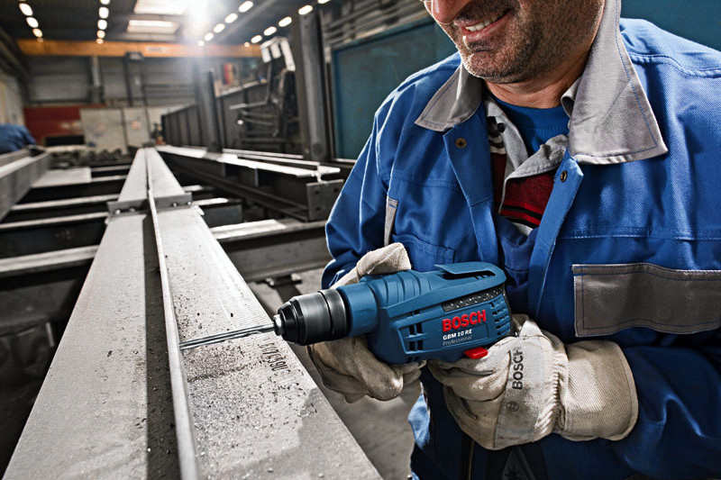 Bohrmaschine GBM 10 RE, Die kabelgebundene GBM 10 RE Professional ist eine kompakte 1-Gang-Bohrmaschine. Ihr zuverlässiger 600-Watt-Motor ermöglicht Bohrungen bis zu 10 mm Durchmesser in Metall. Das leichte und kompakte Gehäuse dieser Bohrmaschine bietet Komfort mit perfekter Handhabung und Wendigkeit bei mittelschweren Anwendungen. Darüber hinaus ist die Spindel dieses Bohrers in den Lagern fixiert. Dies ermöglicht eine hohe Betriebsstabilität und damit ein hochpräzises Bohren. Dieses Elektrowerkzeug eignet sich für Bohrarbeiten in Metall und Holz. Darüber hinaus verfügt die GBM 10 RE Professional über Funktionen wie Rechts-/Links-Lauf und variable Drehzahlvorwahl. Schnellspannbohrfutter 1 – 10 mm (ET-Nr. 2 609 110 750)
