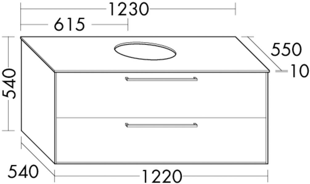 Glasabdeckplatte, farbbeschichtet, 1 Siphonbohrung mittig, Waschtischunterschrank,1 Schublade oben mit Siphonausschnitt, 1 Auszug unten