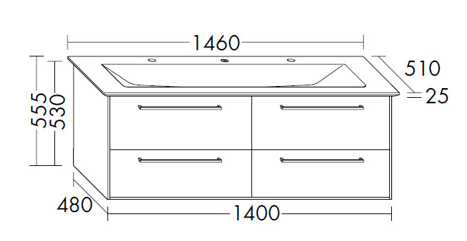 Mineralguss-Doppelwaschtisch: Muldentiefe: 120 mm, Beckenmaß 1260 x 320 mm, Waschtischunterschrank: 2 Schubladen und 2 Auszüge unten