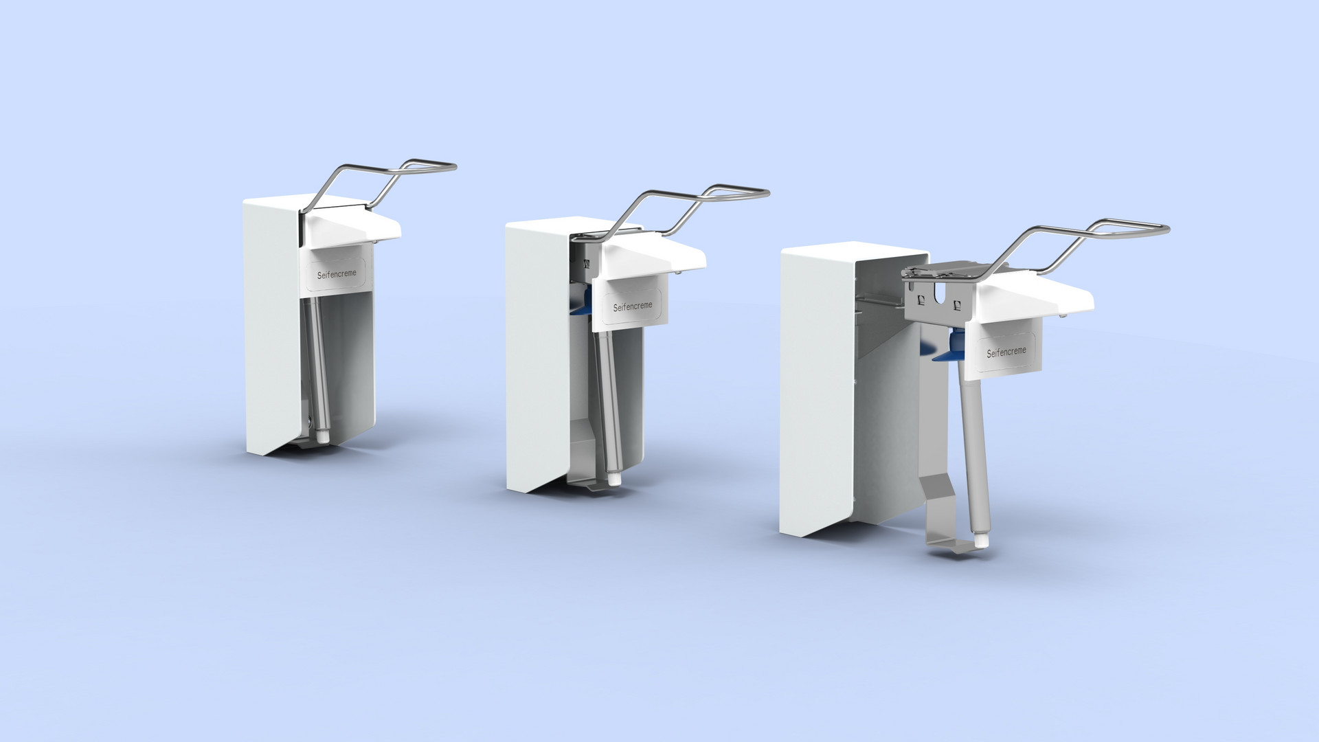 (H x B x T) 310 x 94 x 215 mm, für marktübliche 500 ml Standardflaschen zur Verwendung von alkoholischen Desinfektionsmitteln, flüssiger Seife oder fließfähiger Pflegelotion, mit langem und nach oben abgewinkeltem Edelstahlbedienhebel, autoklavierbar bis 121 °C und 1 bar, wartungsfreie und nach vorn herausziehbare Edelstahldosierpumpe mit geradem Ansaugrohr, Dosierung einstellbar, einsetzbar bei engen Platzverhältnissen unterhalb des Spenders, Spender in Einzelverpackung mit Montageanleitung, Befestigungsmaterial, Zubehörbeutel und je ein auswechselbarer Clip mit der Aufschrift „Seifencreme“ bzw. „Händedesinfektion“