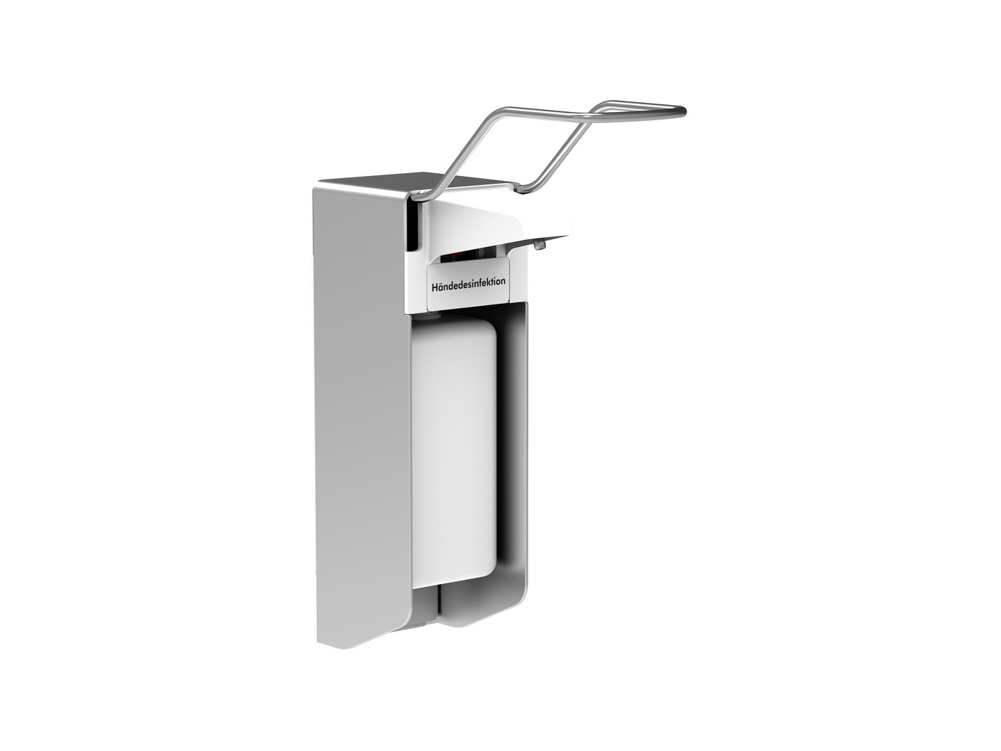 (H x B x T) 252 x 80 x 85 mm, für marktübliche 500 ml Standardflaschen zur Verwendung von alkoholischen Desinfektionsmitteln, flüssiger Seife oder fließfähiger Pflegelotion, mit nach vorn herausnehmbarer Kunststoffpumpe als hygienische Lösung der Einwegverwendung, nach oben verschiebbare Auslaufblende ermöglicht einen Pumpenwechsel ohne den Spender von der Wand zu nehmen, Dosierung einstellbar (max.-min.), Gehäuse aus mattsilber eloxiertem Aluminium, mit langem Edelstahlbedienhebel, autoklavierbar bis 121 °C, 1 bar und spülmaschinengeeignet, Wandhalter aus Kunststoff, Spender in Einzelverpackung mit Montageanleitung, Befestigungsmaterial, Zubehörbeutel und je ein auswechselbarer Clip mit der Aufschrift „Seifencreme“ bzw. „Händedesinfektion“