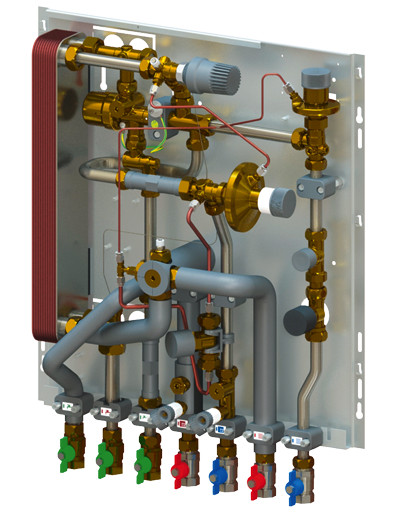 zur Versorgung einer Wohnung mit integriertem Heizkreis und Plattenwärmetauscher zur hygienischen Trinkwarmwasserversorgung, der kupfergelotete Plattenwärmetauscher mit 20 Platten sorgt durch seine lange thermische Länge für temperaturkonstantes Warmwasser, mit Rohrschellen aus Kunststoff zur Schall- und Wärmeentkopplung, DVGW-zertifiziertem PM-Regler mit Vorrangschaltung und gebrauchsmustergeschützter Abdichtungstechnik, Entlüftung, Multifunktionsventilunterteile zum modularen Stecksystem, Schmutzfänger Kaltwasser 0,5 mm, Schmutzfänger HZ-VL primär 0,5 mm, TW-Blende, Zonenventileinsatz mit Blendenverstellung ohne Hubveränderung und Anschlussgewinde M30 × 1,5 für optionale Stellantriebe, Zonenventil DG, Baulänge 68 mm, Kvs-Wert 0,67, voreingestellt auf 0,43, Ziffer 7, AGFW-Fühler, Entleerungsventilen und eines Potentialausgleiches, Kunststoff-Passstück für WMZ 110 × 3/4" AG und Fühleranschluss (AGFW) M10 × 1, folgende Wärmetauscher können auf der gleichen Grundplatte B=555 mm eingebaut werden: kupfer-/nickelgelotete und geschraubte Plattenwärmetauscher bis Plattenanzahl 40, 60 × 55,5 × 15 cm