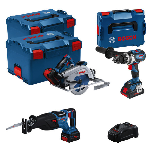 Combo Kit Set mit 3 18V-Werkzeugen: GSB 18V-110C + GKS 18V-68GC + GSA 18V-28 + 1 x 4,0 Ah (PC) + 2 x 5,5 Ah (PC) + GAL 1880CV (L). Die perfekte Kombination von gewerblichen Elektrowerkzeugen mit beeindruckender Leistung und Anwenderschutz. 1 x Akku ProCORE18V 4.0Ah (1 600 A01 6GB). 2 x Akku ProCORE18V 5.5Ah (1 600 A02 149). Schnellladegerät GAL 1880 CV (1 600 A00 B8G)