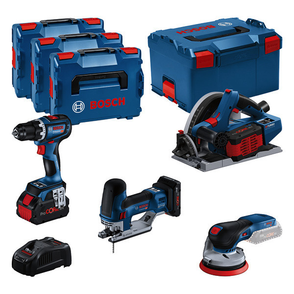 Combo Kit Set mit 4 18V-Werkzeugen: GSR 18V-90C + GKT 18V-52GC + GST 18V-155 SC + GEX 18V-125 + 1 x 4,0 Ah (PC) + 2 x 5,5 Ah (PC) + GAL 1880CV (L). Die perfekte Kombination von gewerblichen Elektrowerkzeugen mit beeindruckender Leistung und Anwenderschutz. 1 x Akku ProCORE18V 4.0Ah (1 600 A01 6GB). 2 x Akku ProCORE18V 5.5Ah (1 600 A02 149). Schnellladegerät GAL 1880 CV (1 600 A00 B8G)