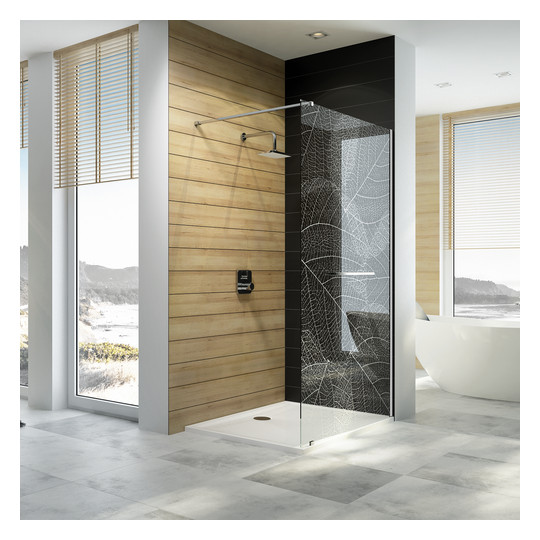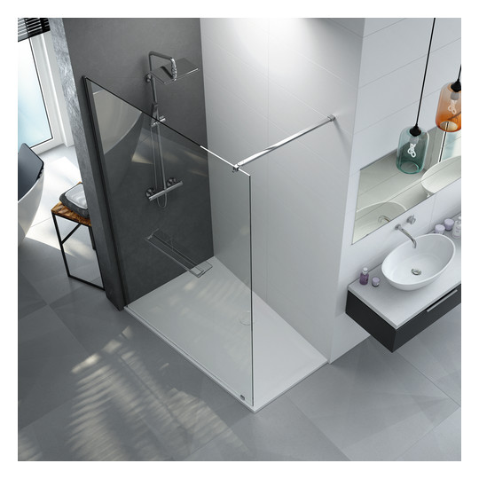 SFA Kinedo Walk In Basic Solo8 90 Duschwand 90cm für offene Duschbereiche Profile Aluminium verchromt Klarglas 8mm mit Antikalkschutzbehandlung Installation wahlweise links oder rechts Höhe 200cm inkl. waagerechte Wandstrebe verchromt mit 2 Gelenkpunkten