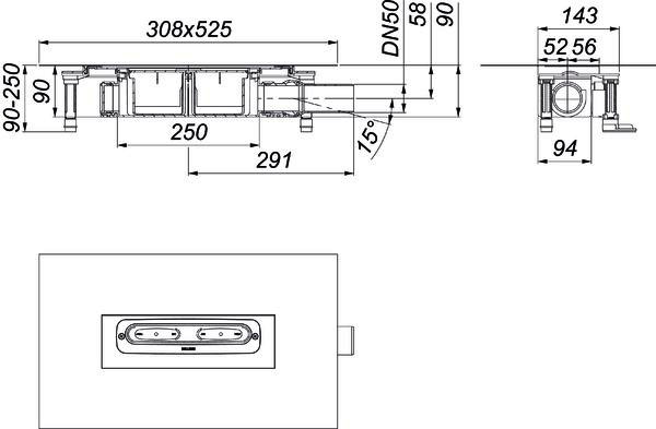 Bauhöhe 90 mm, zum Einbau mit Duschrinne CeraFloor, CeraWall, CeraFrame Individual, Zentrix, Cera Niveau und CeraFrame Liquid, Ablaufstutzen DN 50 seitlich, werkzeuglos an drei Seiten variabel montierbar, mit Kugelgelenk, verstellbar von 0-15°, integrierte Estrichverankerung, flexible Dichtmanschette zum sicheren Anschluss an Verbund- und Bahnenabdichtungen gemäß DIN 18534, vorgefertigter Randdämmstreifen, schallentkoppelte Montagefüße zur Fixierung und Höhenverstellung 90-250 mm, herausnehmbarer Geruch- und Reinigungsverschluss, Sperrwasserhöhe 50 mm (gem. DIN EN 1253), Haarsieb (optional einsetzbar), Bauschutzabdeckung, Ablaufgehäuse und Ablaufstutzen Polypropylen, hochschlagfest