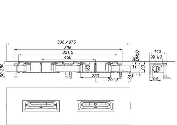 Bauhöhe 90 mm, nach DIN EN 1253, zum Einbau mit Duschrinnen CeraWall Select Duo, CeraWall Individual Duo und CeraFloor Select Duo, zwei Ablaufstutzen DN 50 seitlich, werkzeuglos an drei Seiten variabel montierbar, mit Kugelgelenk verstellbar von 0–15°, integrierte Estrichverankerung, flexible Dichtmanschette zum sicheren Anschluss an Verbundabdichtungen gemäß DIN 18534, vorgefertigter Randdämmstreifen, schallentkoppelte Montagefüße zur Fixierung und Höheneinstellung 90-250 mm,, herausnehmbarer Geruchs- und Reinigungsverschluss, Sperrwasserhöhe 50 mm (gem. DIN EN 1253), Haarsieb (optional einsetzbar), Bauschutzabdeckung, Ablaufgehäuse und Ablaufstutzen Polypropylen, hochschlagfest