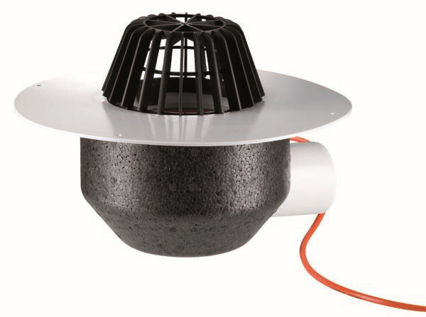 nach DIN EN 1253, Flansch zum Anschluss von PVC-Dachbahnen, Ablaufgehäuse wärmegedämmt, Ablaufstutzen seitlich und 3° abgewinkelt, Laubfangkorb, aus PVC, Dachablauf 64 H PVC beheizbar, Direktanschluss an 230 Volt, Heizband nach VDE 0721, Teil 1/3.78 geprüft, Leistungsaufnahme pro Dachablauf 15 Watt, Rechnungswert für Absicherung pro Dachablauf 0,06 Ampere, empfohlene Absicherung pro Dachanlage 16 Ampere