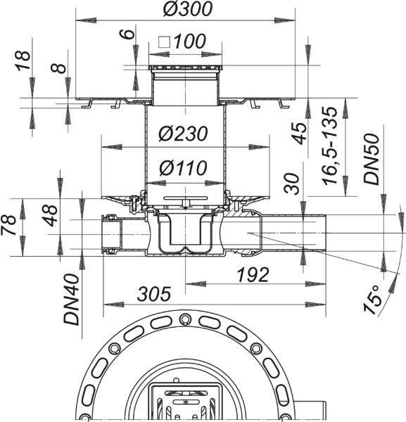 Komplettablauf bestehend aus Bodenablaufgehäuse 42 S, TistoDrain Aufstockelement S 10 und einem stufenlos bis zu 40 mm höhen- und bis zu +/-5,5 mm seitenverstellbaren Aufsatz