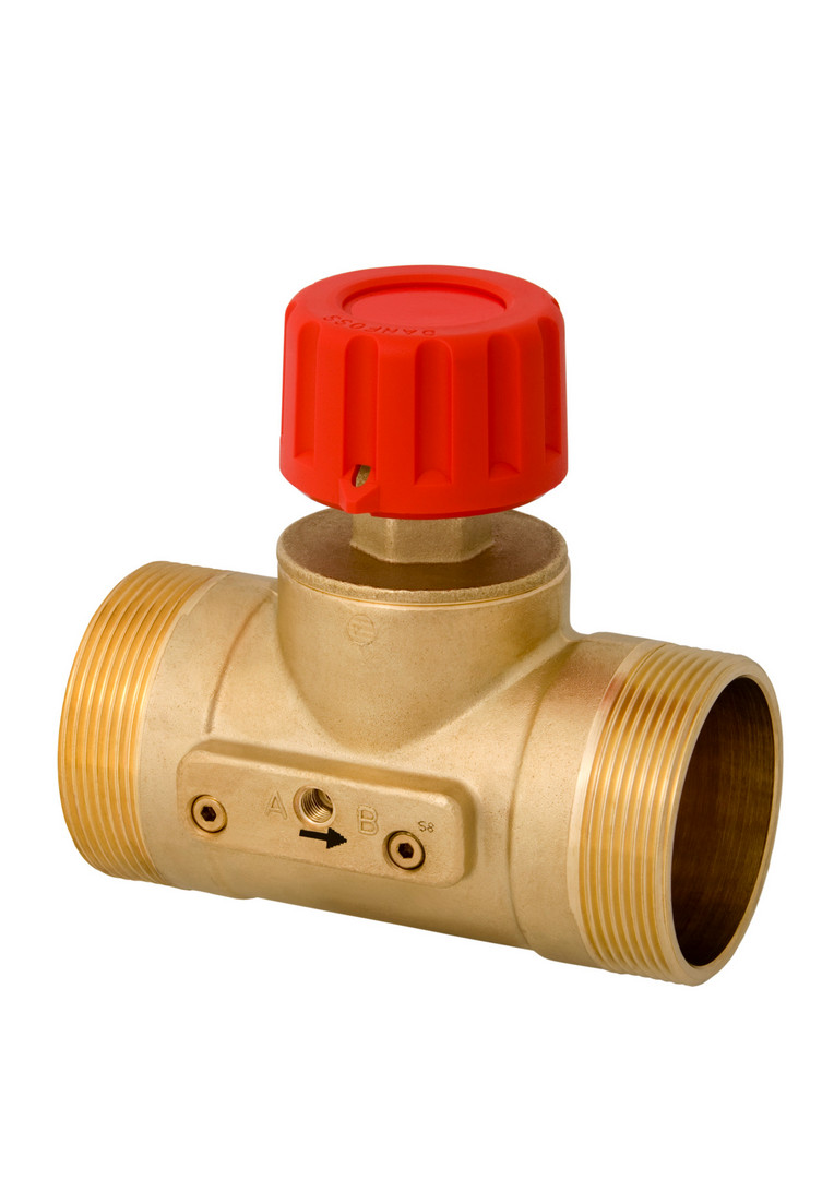 zur Kombination mit Strangdifferenzdruckregler, Anschlussmöglichkeit für die Impulsleitung und Messnippel mit rotem Handrad, max. Differenzdruck über dem Ventil 1,5 bar, max. Wassertemperatur 120 °C, mit grauer Isolierschale bis 80 °C, PN 16