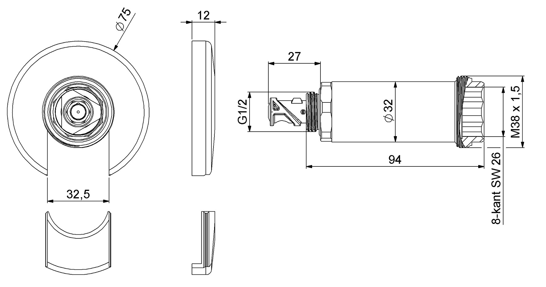 Anschlussarmatur für Rundstromventile DIN 3500, Hamburger Kolben: Standardlänge, Einbautiefe max. 26,5 mm