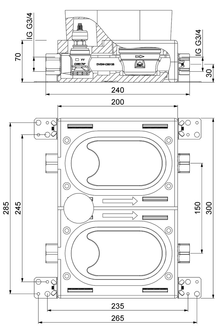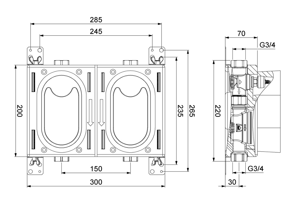 Deltamess Miniblock-Duo 300x200x70mm, 3/4" IG, DN 20, Messing