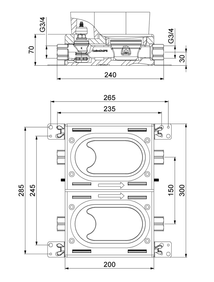 Deltamess Miniblock-Duo 300x200x70mm, 3/4" IG, DN 20, Rotguss
