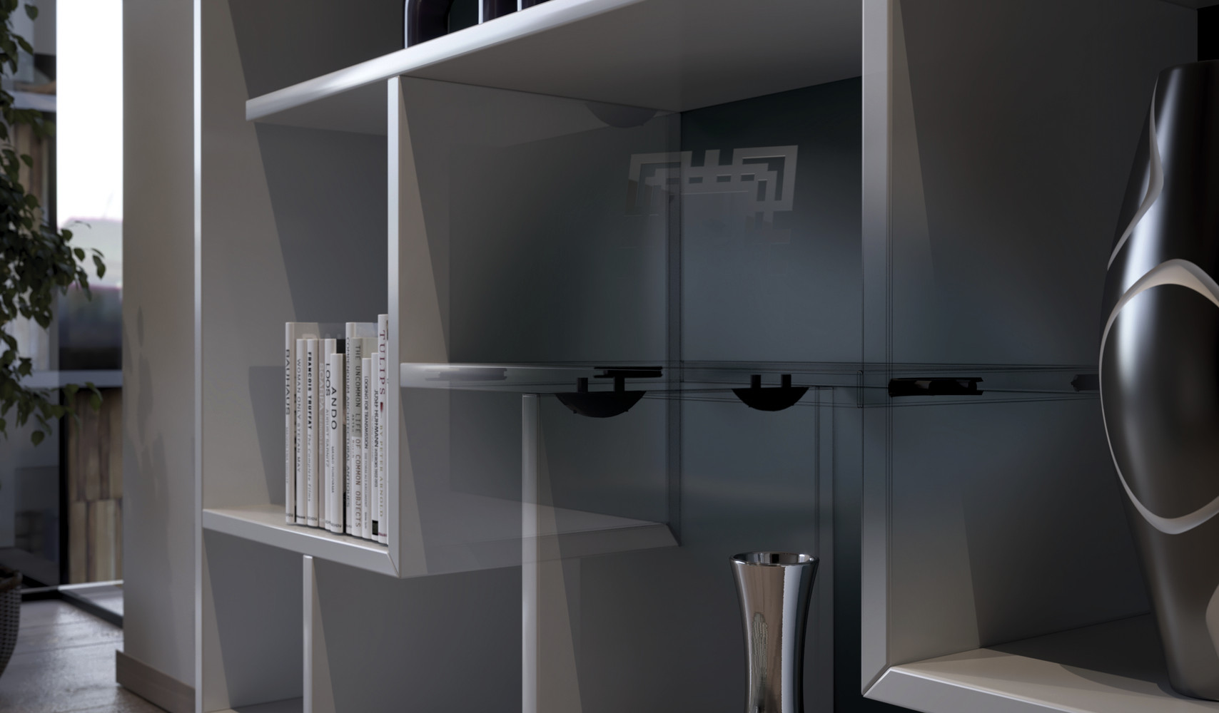 Divario P-18 ist ein wiederlösbarer Möbelverbinder zum Einschieben. Die Nut wird mit der Nutfräsmaschine Zeta P2 oder einem CNC-Bearbeitungszentrum gefräst und der Verbinder mittels der formschlüssigen P-System Nut sekundenschnell im Werkstück verankert. Der Divario P-18 ist so konzipiert, dass er die Werkstücke beim Einschieben zusammenspannt und so für sauber geschlossene Fugen sorgt. Der Spannungsaufbau selbst findet nur punktuell und nicht über die ganze Einschublänge statt, was das Einschieben erleichtert. Da kein Hebel oder Exzenter bedient werden muss, ist die Montage sehr effizient und der Verbinder unsichtbar. Wird ein Möbel oder ein Regal mit mehreren fixen Tablarböden oder Trennwänden hergestellt, bietet der Divario P-18 die Möglichkeit, den äusseren Korpus als Erstes zu verbinden. Danach wird das Innenleben, also Trennwände oder Konstruktionsböden, Stück für Stück eingeschoben. So kann eine Bücherwand in Einzelteilen oder nur als einfacher Korpus platzsparend und mit geringerem Gewicht transportiert werden. Vor Ort werden die Tablarböden einfach nur noch eingeschoben. Durch die kraftschlüssige Verbindung zwischen den Bauteilen kann die Verbindung hohe Zugkräfte übernehmen. So kann bspw. ein vertikaler Mittelsteg die Unterseite eines hängenden Regals stabil verbinden und Last aufnehmen. Im Tablarboden wird eine vorne abgesetzte Nut eingefräst, damit das Werkstück über die vorstehende Verbinderhälfte in der Seite geschoben werden kann. Für die Herstellung eines beidseitig sichtbaren Regals kann die kleine Nut an der hinteren Seite des Fachbodens störend sein. Hierzu wird die Längsnut beidseitig abgesetzt, sodass die Verbindung von allen Seiten komplett verdeckt ist. In dieser Anwendung wird der Tablarboden nicht nachträglich eingeschoben, sondern wird während des Aufbaus des Regals aufgesteckt und verschoben, bis er festklemmt.